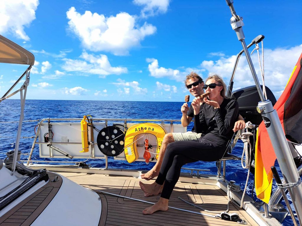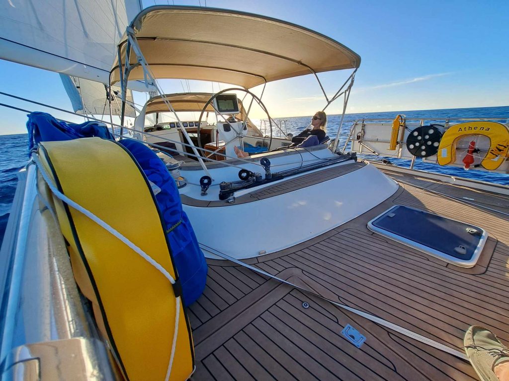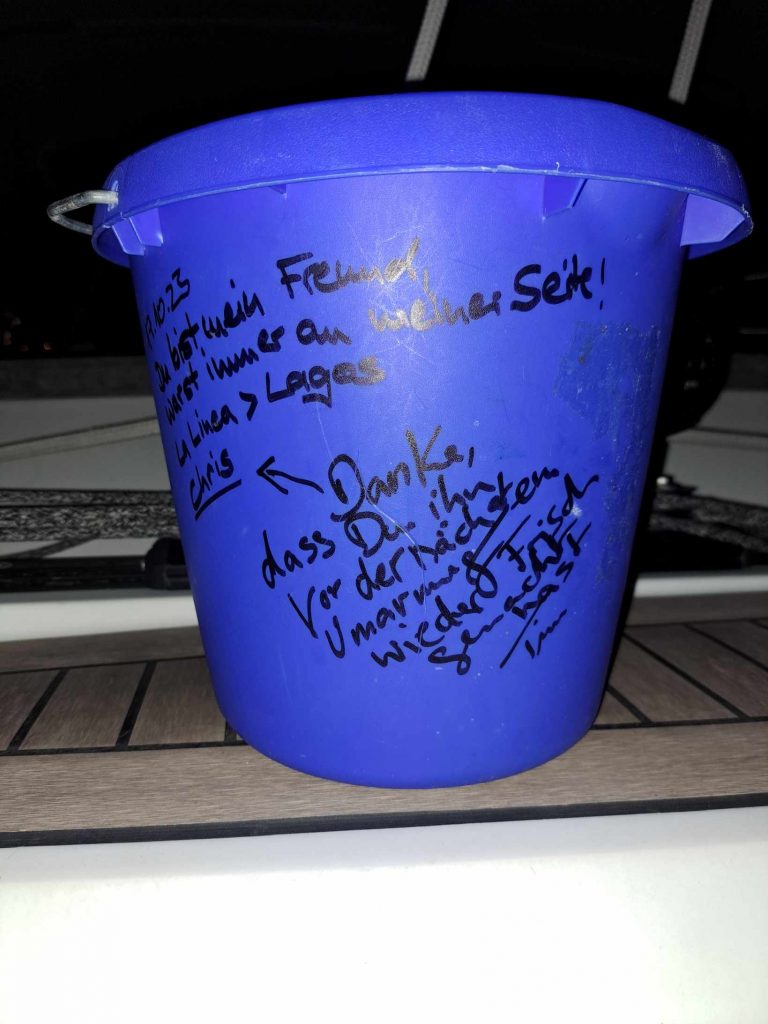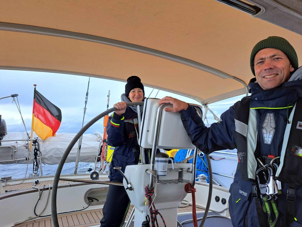 Mit ðer Ankunft von Steffi ging dann die Sonne auf. Am Montag Morgen, den 23.10. um 6 Uhr setzten wir Segel Richtung Süden, Richtung Kanaren. Wind und Sonnenschein begleiteten uns.